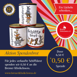 Und doppelt toll: für jedes des verkauften Dosen-Brots gehen 50 Cent direkt an die Bremer Klinikclowns! Wir freuen uns sehr über das wunderbare Engagement und die super Unterstützung, bedanken uns von ganzem Herzen und wünschen allen Schiffsbrötler*innen einen guten und gesunden Appetit! Lasst es euch schmecken!